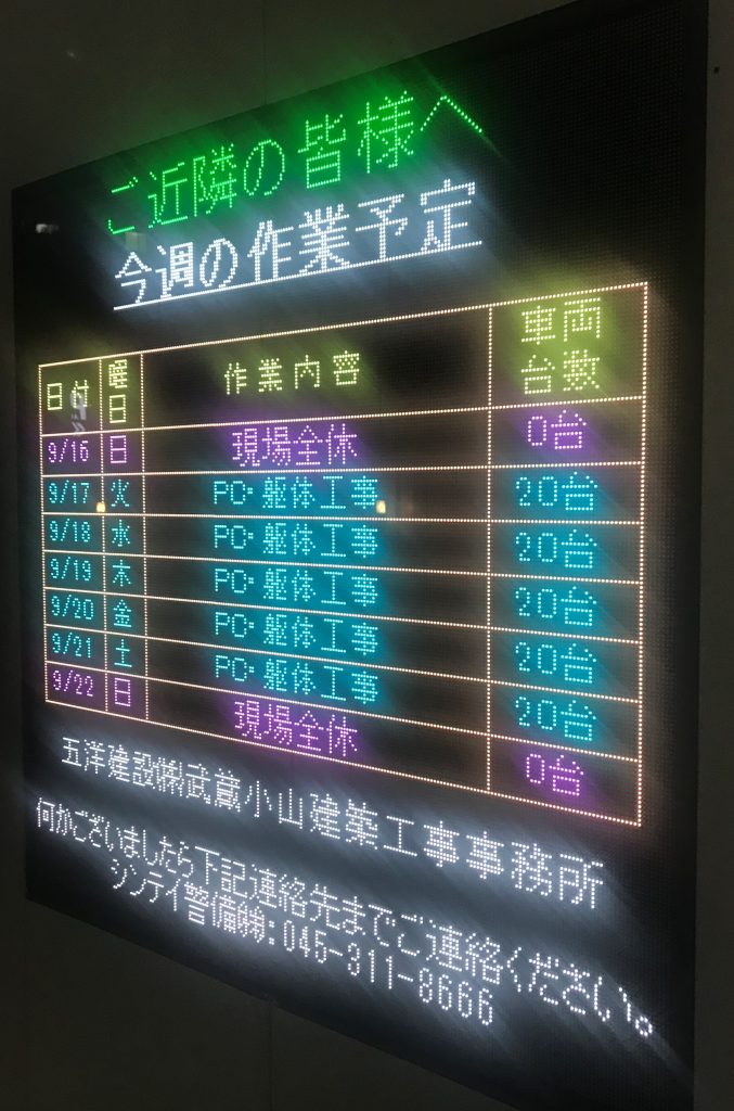 武蔵小山再開発ウォッチ 再開発#10916 投稿日:9月 16, 2019 更新日:9月 17, 2019 令和元年9月16日(月)敬老の日で休み。現場は今日まで3連休ということでしょうか。ちなみに掲示板の曜日の表記に誤りがあるようです。 北西から 西側外柵の電光掲示板 Twitter Facebook Google+ Pocket B!はてブ LINE -武蔵小山再開発ウォッチ -工事予定 執筆者:のと