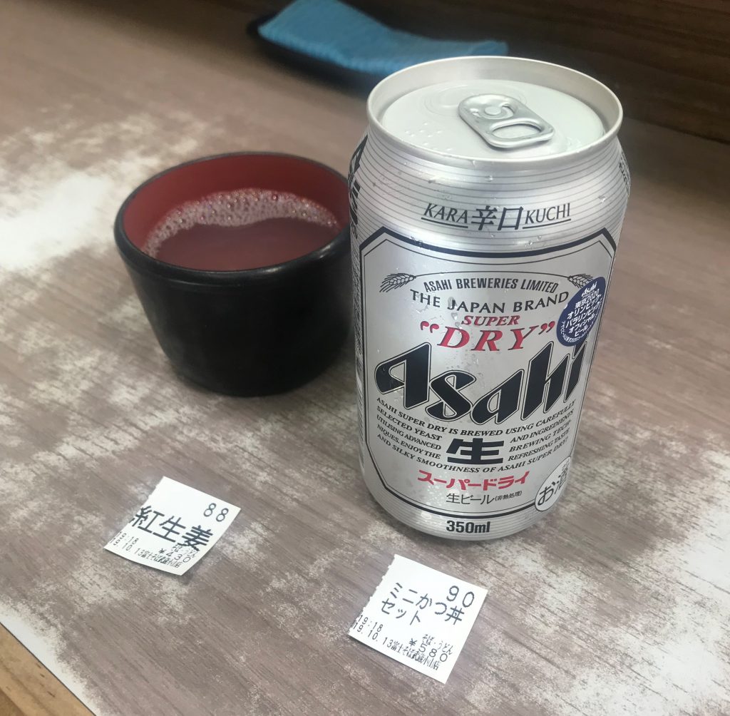 ミニかつ丼セットに今回はビールをおまけ。久しぶりの深夜勤務明けということで、細やかな打ち上げだ。