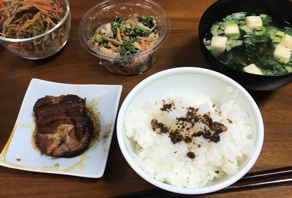 夕飯は、ふりかけと煮豚を消化したかったため、自宅にて土鍋で白米を炊いて。