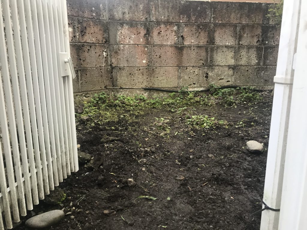 作業を進めていくと、ここにもヤブガラシの蔓が4本発生していた。これらは刈らず・抜かずに残しておき、全体の除草が終わってから薬をかけて丸めて縁の下へ押し込んだ。
