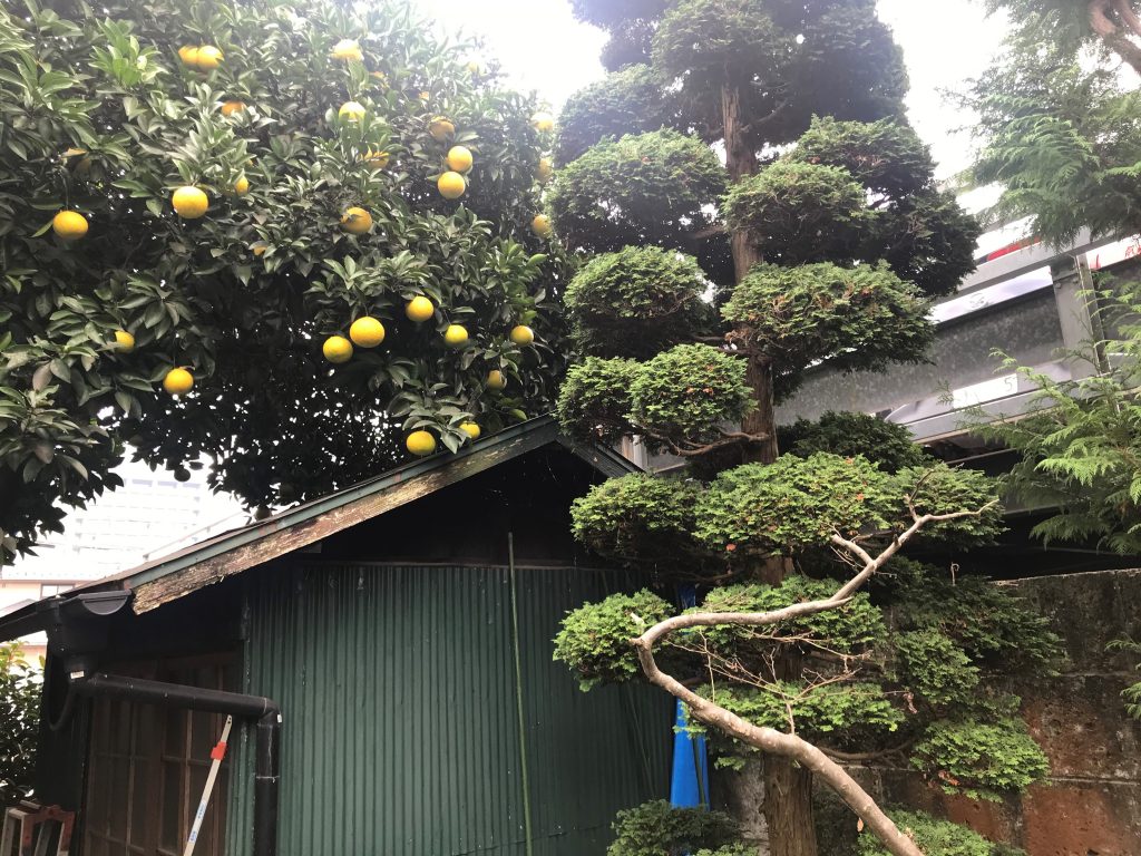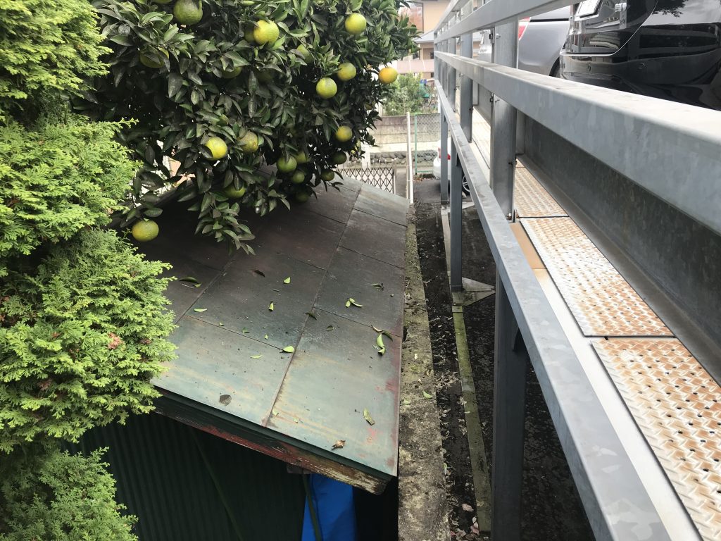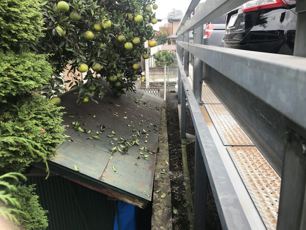 物置の上にかかる八朔の枝からの落葉が、隣の駐車場に落ちて迷惑をかけてしまうので、可能な限り外側斜面の上の枝葉を前もって取り払い、落ち葉を減らそうという試み。屋根が老朽化して上に乗るのは危険なため、石塀の上を移動しながらの作業となった。