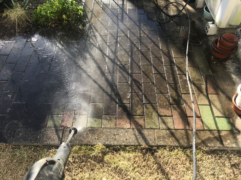 昨日に続いて某庭のインターロッキングを高速洗浄していく。
