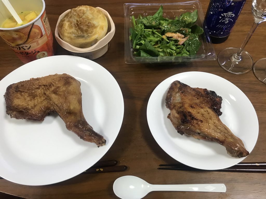 夜は自宅にて、買った売り物のチキンを食べ比べ。