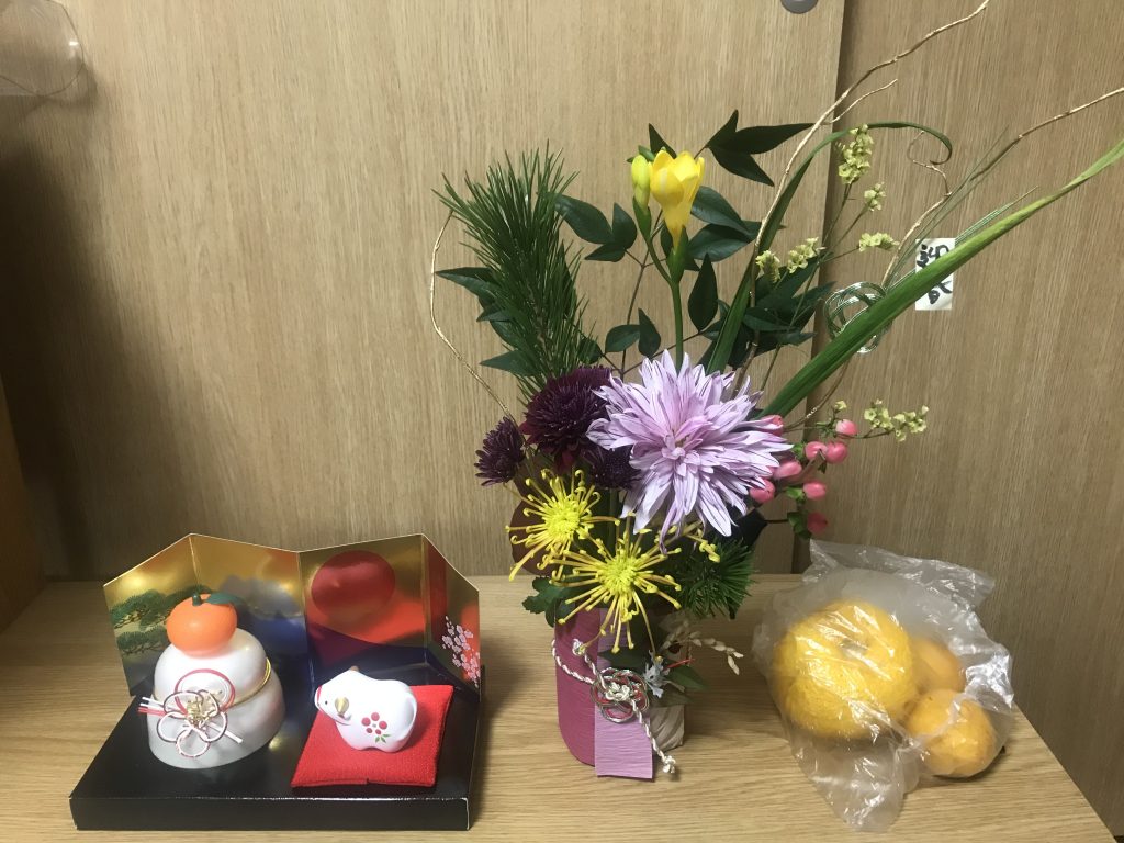 自宅に鏡餅と、グリーンガレージマーケットから入手した花が設置された。
