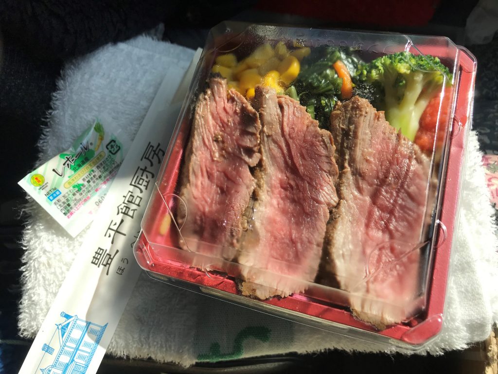 どこに座って食べるか検討したものの、良い案が見つからず、結局は車中に落ち着いた。手のひらサイズのステーキ弁当、温めなくても十分に美味しく頂いた。