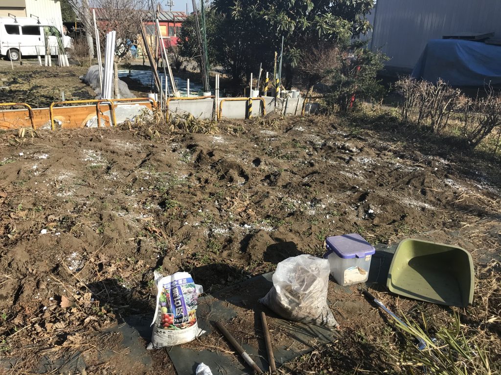 火の様子を見ながら、ツゲもバッサリと剪定。こちらの枝は燃えそうにないので次回に譲る。そしてメイン。東側区域に石灰を撒き、耕す。