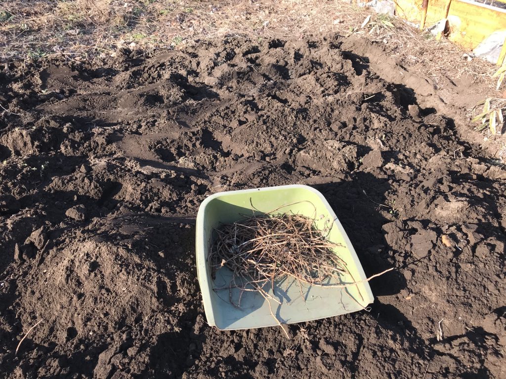 例によって、耕しているとヤブガラシやササの根が出てくるので、それらは回収してゴミ袋へ。