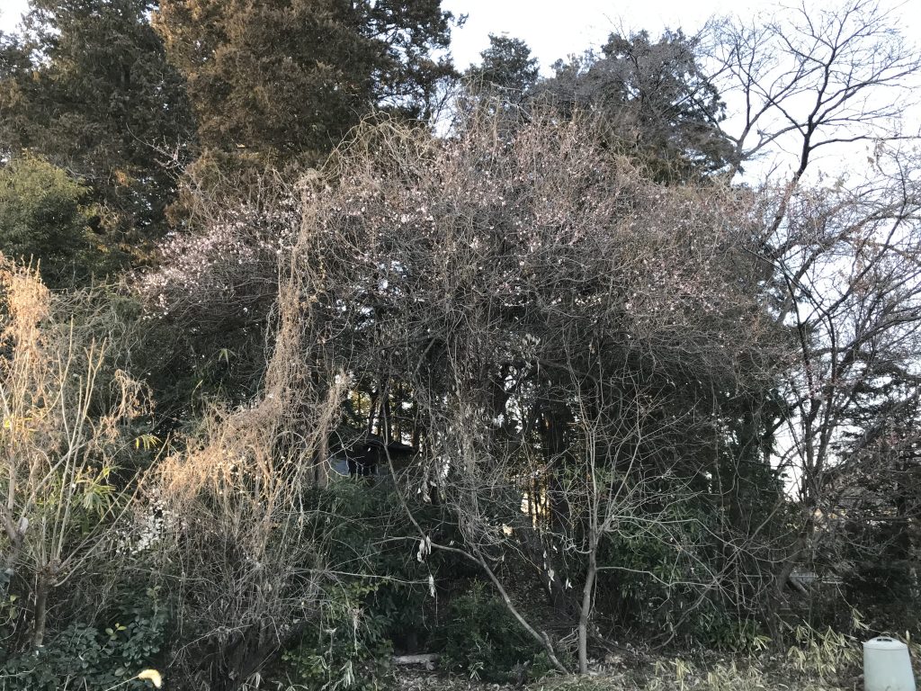急いで帰らなくてはならないが、その前に梅の花を土産に持って帰ろうという話になり、高枝切り鋏でチョッキリ。