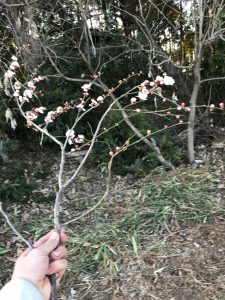 昨日、持ち帰った梅の枝は、規模が小さすぎて不評?だったため、長めの枝で再チャレンジである。