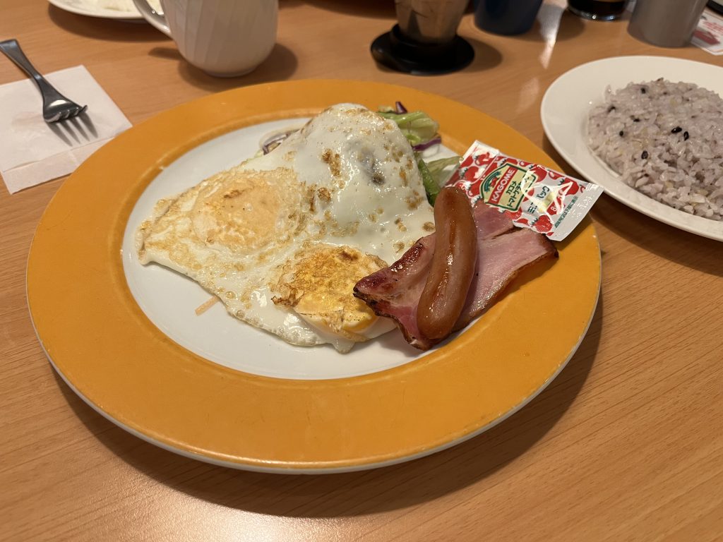 シラス御飯がメニューから消えてしまったので、仕方なく目玉焼きのセットを選択。どんな様子か確かめるべく、両面焼きを頼んでみた。