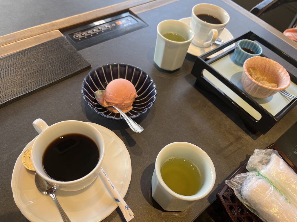 デザートはわらび餅と季節のアイスクリームを選択。この時期は苺のアイスだそうな。ドリンクメニューにコーヒーが載っていなかったのでスタッフに尋ねてみたら、提供可能との事なのでお願いした。煎茶はデザートに付いてきた。