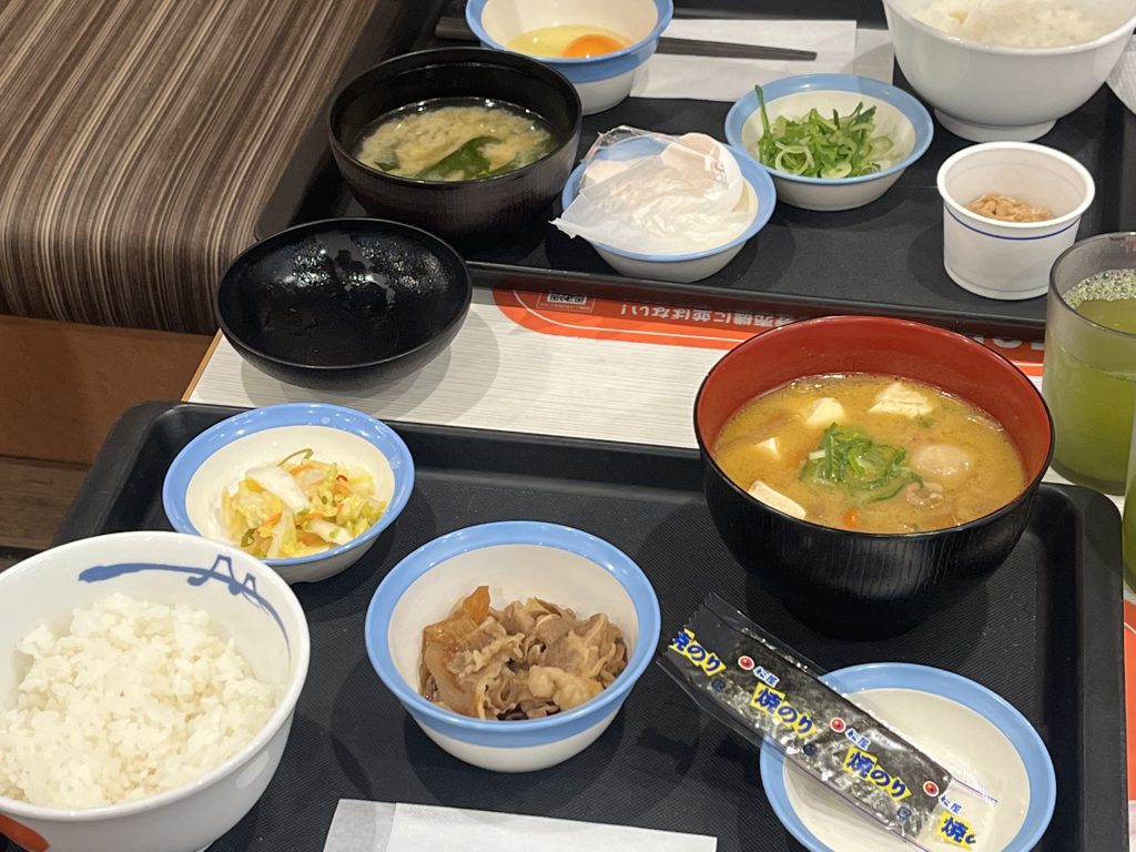 朝一の業務を一段落させ、外出して朝食を摂る。行先はいつもの松屋だが、今回は気分を変え、とろろと半熟卵ではなく豚汁や牛皿を選んでみた。この選択だと、海苔が付くのを知って新鮮な印象を受ける。そして、寒い朝の豚汁も体が温まって良いと思う。