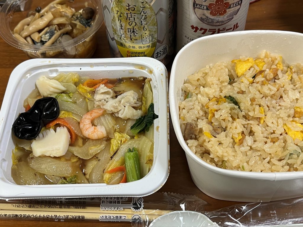 仕事の後の一杯兼夕食には、某コンビニの八宝菜と炒飯を頂いた。nanacoのポイントが多く貰えるキャンペーンが開催中なので、それに乗せられてしまっている。